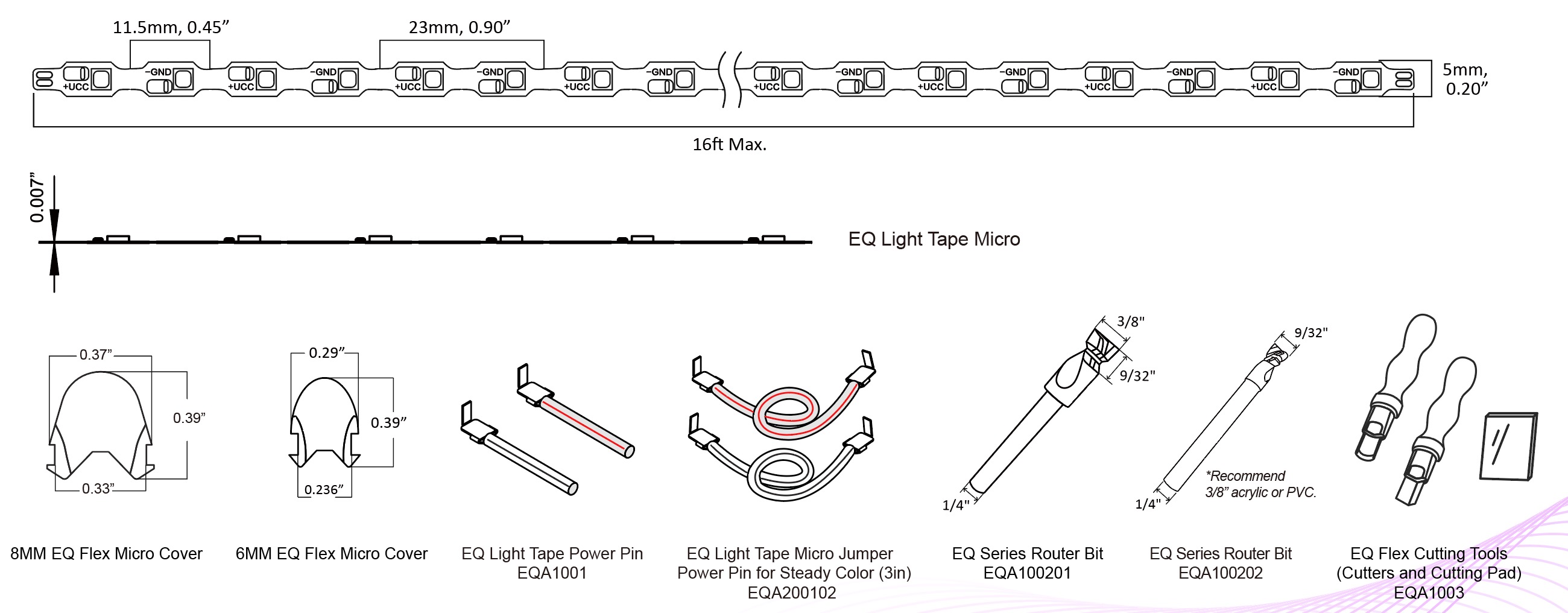 The EQ Micro Flex simplifies the process of creating neon signs, making it more user-friendly and cost-effective than ever. This innovative product consists of two main components: the EQ Micro LED tape, which boasts a solderless design for ease of use, and separate flex covers available in a variety of colors to suit your style. Additionally, the essential bits for routing are included as accessories, ensuring you have everything you need.
